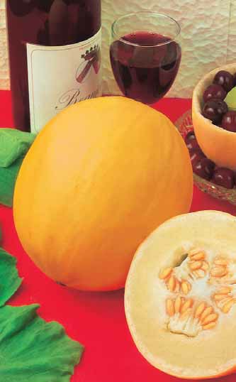 Необычайно урожайный, десертный сорт. Плоды округлые, коричнево-желтые, с густой сеткой, массой 1,5-2 кг, Мякоть кремовая, толстая, нежная, очень сочная и сладкая, тающая, с гармоничным ароматом и длительным послевкусием. Дегустационная оценка 4,8 балла.