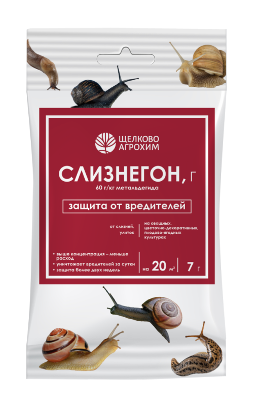 Инсектицид «Слизнегон» предназначен для борьбы со слизнями и улитками на овощных, ягодных, декоративных культурах и винограде. Характеристики: Действующее вещество: 60 г/кг метальдегида. Слизнегон не токсичен для растений, безопасен для дождевых червей и полезных насекомых. Но для человека и домашних животных метальдегид опасен, если его проглотить. Поэтому гранулы специально окрашивают в яркий голубой цвет, чтобы не привлекать птиц и животных.